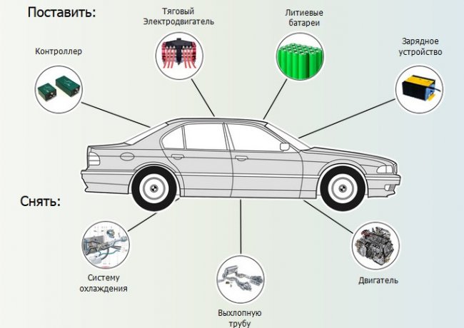 Чтобы сделать из авто с двигателем внутреннего сгорания полноценный электрокар, мастера "вытаскивают" топливную, выхлопную систему, бензобак и всё, что относится к бензину, дизелю или газу, и устанавливают электромотор.