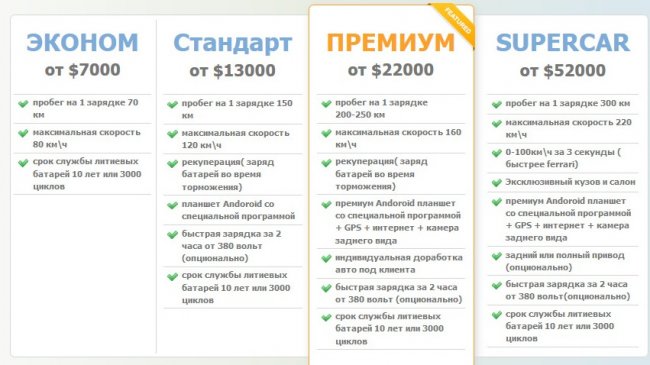 Третья ценовая категория «Премиум» — от 22 тысяч долларов. Пробег на одной зарядке — 300-450 км.