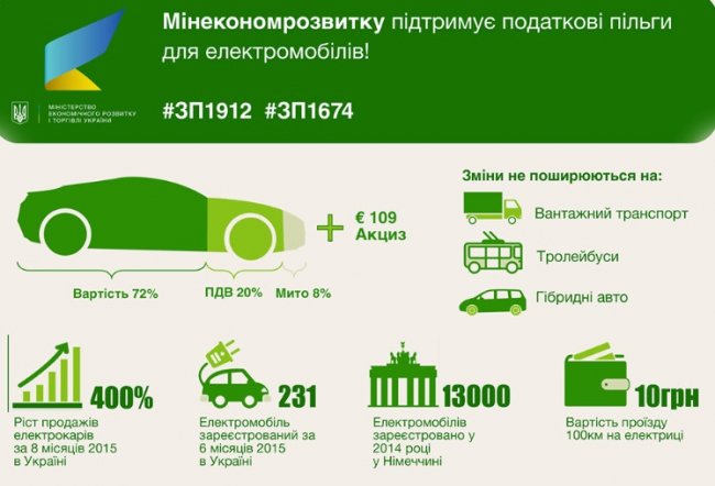 «Если законопроекты №1674 и №1912 пройдут второе чтение в Верховной раде успешно, мы получим возможность покупать экологические электромобили на 28% дешевле", - говорится в публикации соцсети.