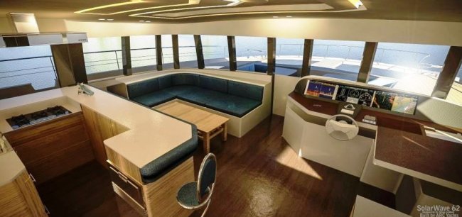 На крыше Solarwave 62 установлен массив из фотоэлементов мощностью 15 кВт, который поставляет энергию в аккумуляторные блоки общей емкостью 100 кВт*ч. Количество батарей может быть изменено, в соответствии с нуждами владельца яхты и количества техники, установленной на борту.