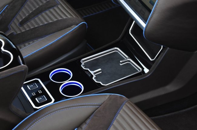В салоне Тесла Модел С от Брабус установлены дополнительные брендированные накладки на порогах из нержавеющей стали, сидения перешиты новой кожей и алькантарой с контрастной прострочкой, а подстаканники в центральном тоннеле получили функции охлаждения и подогрева, а также подсветку. Стоимость такого тюнинг-пакета не сообщается.