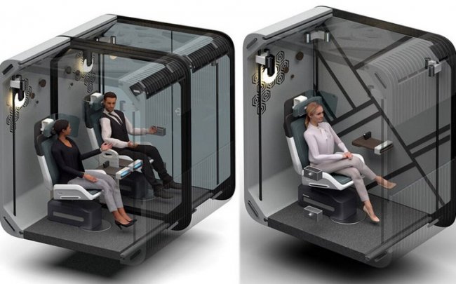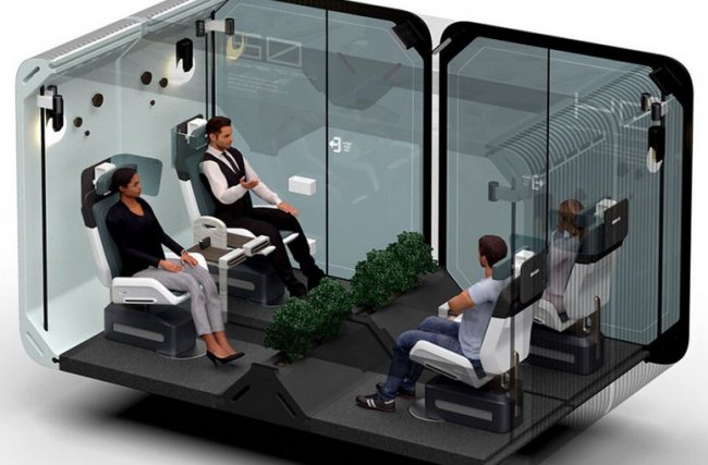 В капсуле на четырех человек сохраняется безопасное расстояние между людьми и даже есть живые растения, которые не только создают успокаивающий эффект, но и поддерживают психологический барьер между попутчиками.