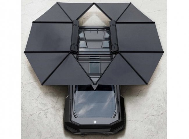 Новый концепт полностью электрического внедорожника получил огромную аккумуляторную батарею, угловатый и агрессивный дизайн (который во многом напоминает Cybertruck) и выдвижные солнечные панели для автономного питания. А в качестве опции, если пользователь пожелает увеличить запас хода и мощность привода, он может установить два дополнительных колеса и аккумулятор, которые собраны в виде самобалансирующейся съемной тележки, делающей машину полноприводной.