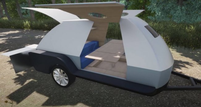 В центре жилого блока с внутренней высотой 140 см разместится обеденная зона, трансформируемая в кровать размером 198×156 см. По бокам от нее предусмотрят еще два узких спальных места, поэтому внутри прицепа сможет с достаточным комфортом ночевать семья из четырех человек. Широкие двери типа «крылья чайки» обеспечат удобство входа и выхода, а также отличный обзор на окружающую природу изнутри кемпера во время стоянок.