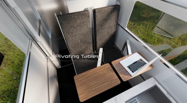 Основное помещение кемпера может использоваться как кухня, рабочий кабинет, гостиная или спальня. В оборудование кухонной зоны входят большая раковина, автоматически открывающиеся и задвигающиеся ящики, смеситель с голосовым управлением, индукционная плита, холодильник, фарфоровая столешница площадью почти 0,5 квадратных метра, а также теплый пол.