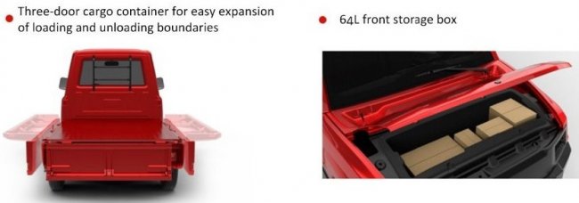 Борта кузова откидываются в стороны, облегчая доступ к грузовой платформе и позволяя существенно увеличить ее ширину для перевозки объемных предметов. В передней части пикапа нашлось место для закрытого 64-литрового багажного отсека.