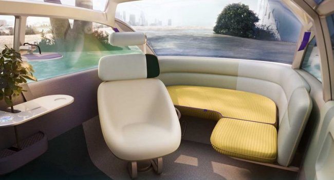 Салон автомобиля поделен на три зоны. Передняя часть, где находятся органы управления, может становиться местом для дневного отдыха и «верандой». Для этого приборная панель опускается, превращаясь в угловой диван, а лобовое стекло поднимается, образуя козырек.