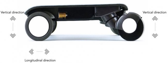 На каждом из четырех углов Walkcar расположено по колесику, поэтому он вполне устойчив. В передние колеса встроены электромоторы, обеспечивающие движение устройства, а задние колеса используются для маневрирования. Несмотря на компактные размеры девайса, в нем нашлось место для подвески, которая гасит как вертикальные, так и продольные колебания.