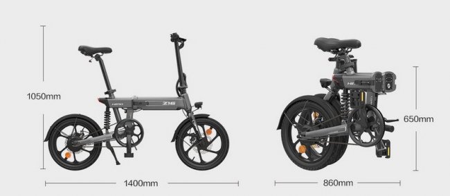 Himo Z16 имеет раму из алюминиевого сплава с интегрированными фонарями и заднюю подвеску, более характерную для мопедов, мотоциклов и двухподвесных маунтинбайков. Его масса составляет 22,5 кг, вес седока ограничен 100 кг.