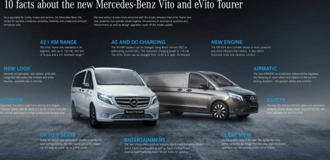 «eVito Tourer используется преимущественно как пассажирский транспорт и для перевозки делегаций, и именно для обеспечения потребностей этих групп мы предлагаем ускоренную зарядку и увеличенный пробег на одном заряде», - говорит производитель.