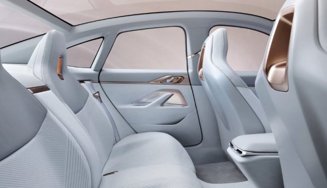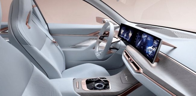 В BMW также отметили, что некоторые детали интерьера в концепте уже отображают реальные решения для серийного i4. Это относится к большому изогнутому дисплею панели приборов и развлекательной системы. Ориентированная на водителя мультимедийная панель станет частью будущих электрокаров.