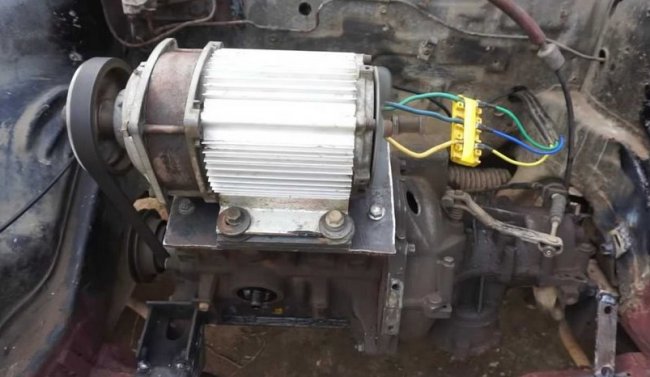 На место ГБЦ легла толстая цельная металлическая пластина, которую прикрутили к блоку «родными» для двигателя болтами. На пластине закрепили 3-киловаттный электромотор, рассчитанный на напряжение 60 вольт.