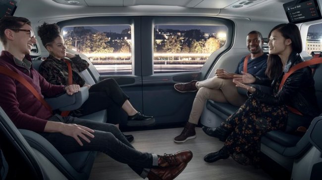 Электрокар предназначен для работы в полностью автономном режиме, следовательно, не имеет водительского кресла, рулевого колеса, педалей газа и тормоза. Вместо этого удобный салон легко вмещает шесть пассажиров, которые сидят напротив друг друга в конфигурации 3 + 3, при этом разработчики явно обратили внимание на обеспечение простора для ног. Двери – раздвижные и, как заявляется, предоставляют достаточно места для одновременной посадки двух человек и даже велосипедиста со своим байком. Очень низкий подъем также делает автомобиль более привлекательным для пассажиров с ограниченными возможностями.