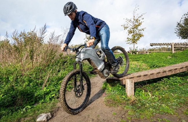 Велосипед выполнен в очень своеобразном дизайне и не всякому может показаться привлекательным. Основу составляет массивная литая рама из алюминия. А вот внутри нее, в педальном блоке, установлен мотор от немецкого производителя TQ, имеющий крутящий момент 120 Н/м. В зависимости от комплектации его мощность может составлять 250, 500 или 920 Вт.