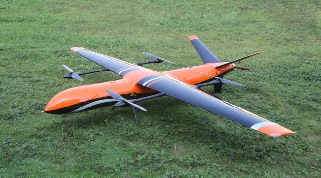 Поднимается в воздух беспилотник с помощью парных винтов, расположенных на крыльях, а горизонтальный полет осуществляется при поддержке заднего винта.