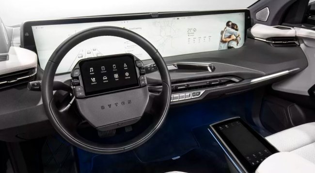 Как и ожидалось, главные особенности M-Byte находятся внутри, где 48-дюймовый изогнутый дисплей растянут вдоль всей передней панели, а меньшего размера 8-дюймовый дисплей «планшета водителя» встроен в ступицу руля. Дисплеи будут работать совместно с информационно-развлекательным пакетом «Byton Cloud», способным выходить в сеть интернет со скоростью передачи данных 5G.