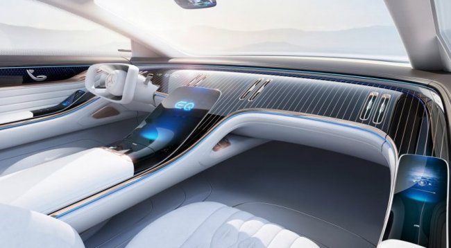 Интерьер автомобиля будет выполнен в минималистичном стиле с использованием ряда инновационных материалов. Центральный дисплей, органично выходящий из центральной консоли, обеспечит новый взгляд на эргономику, говорят в Mersedes. А функциями электрокара можно будет управлять с помощью множества сенсоров на различных поверхностях. Максимальный комфорт будет обеспечен индивидуально каждому пассажиру за счет специального интерфейса человек-машина. Это обеспечит светодиодная подсветка, которая не только создает особые световые настроения внутри автомобиля, но также может передавать информацию пользователям.