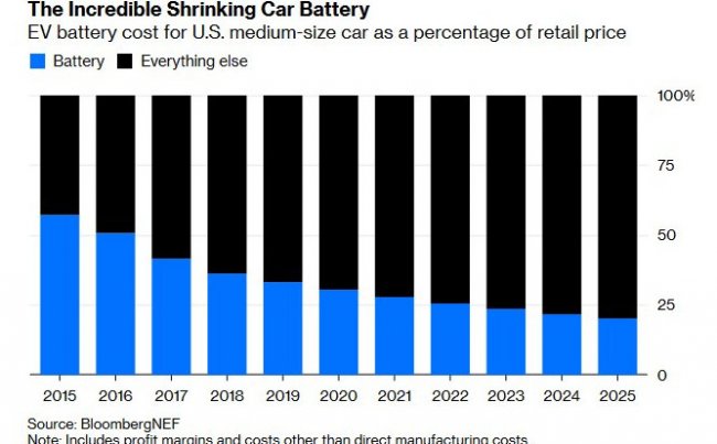 Главным источником удешевления электромобилей является снижение стоимости литий-ионных батарей: несколько лет назад они занимали долю почти 50% в себестоимости автомобиля, теперь она равна 33%, а к 2025 году прогнозируемо упадет до 20%.