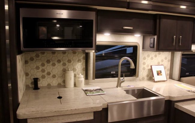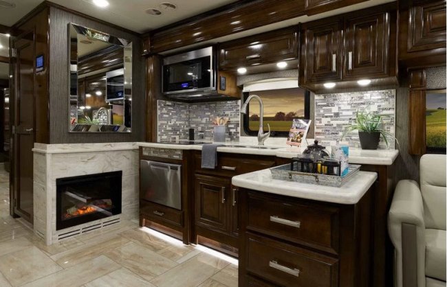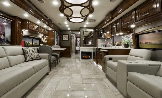 Благодаря использованию выдвижных панелей с обеих сторон Tuscany 45JA отличается весьма просторным внутренним пространством. Планировка роскошного дома на колесах включает главную спальню в задней части, просторную ванную, кухонный и спальный камины, 566-литровый холодильник. Есть возможность и установки по всей площади теплого пола, позволяющего даже зимой ходить внутри автодома босиком.