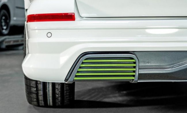 Электрокар получил новый обвес, добавляющий объема переднему и заднему бамперу, модифицированную решетку радиатора, 20-дюймовые колеса ABT Sport GR с шинами Continental, заниженную подвеску и специальные крышки-жалюзи, скрывающие то, что e-Transporter не имеет выхлопных труб. В цветовой палитре преобладает белый со вкраплением графики серого и зеленого оттенка.