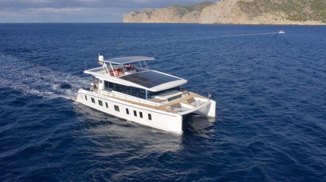 Яхты Silent 55 выглядят очень привлекательно снаружи и внутри. Большая часть пространства верхней палубы занята солнечными панелями.