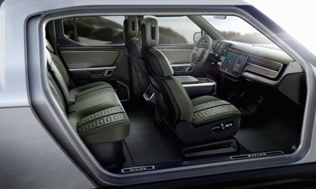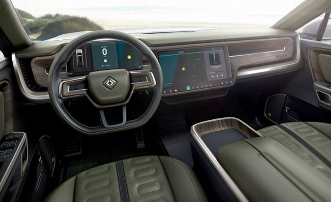 Rivian R1T будет предлагаться только с двурядной пятиместной кабиной. Обещаны материалы отделки премиального уровня, на передней панели – два дисплея, заменяющие щиток приборов, всевозможные кнопки и мультимедийную систему. Свой 6,8-дюймовый мультифункциональный экранчик есть и у пассажиров второго ряда. В оснащение входят 8 подушек безопасности, а также оборудование, необходимое для автоматического пилотирования 3 уровня по классификации SAE – камера, лидар, радар, ультразвуковые датчики, высокоточная система спутникового позиционирования. Весь фирменный софт будет периодически обновляться «по воздуху».