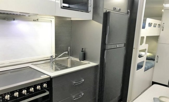 Путешественникам не придется готовить в поле на огне, потому что в их распоряжении есть трехкомфорочная газовая плита с электрической духовкой внизу: можно варить, жарить, печь и даже готовить на газовом гриле. Мойка рядом с плитой имеет отдельный кран для питьевой воды, а позади нее расположен двухкамерный холодильник.