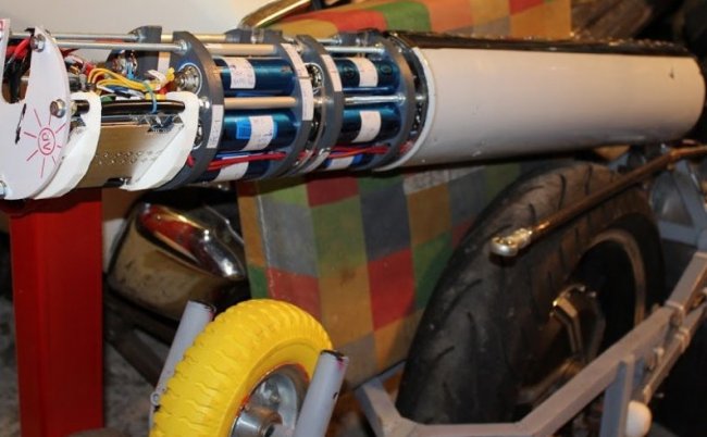 Алюминиевый цилиндр, смонтированный поверх колеса, служит не только сиденьем для мотоциклиста, но и резервуаром для блока из двадцати литий-железо-фосфатных аккумуляторов. Торпеда заканчивается небольшой турбиной, а вся электроника, обеспечивающая автономную настройку баланса моноцикла, спрятана в корпус головного фонаря от старого «Урала», который придает транспортному средству сходство с ретроагрегатами.