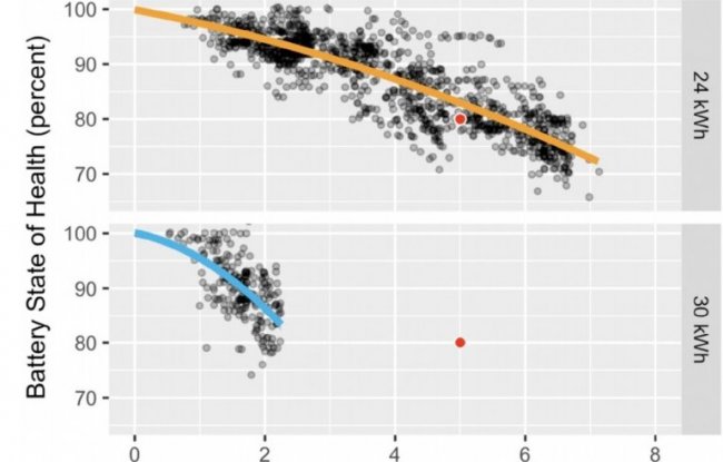 Это гораздо лучше, чем предлагает Nissan для батареи электромобиля Leaf — 66 % номинальной ёмкости после 100 тыс. миль (161 тыс. км) пробега. Согласно последним данным, батарея Nissan Leaf ёмкостью 24 кВт*ч теряет спустя 5 лет службы 20%, а батарея ёмкостью 30 кВт*ч деградирует ещё быстрее.