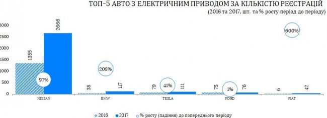 Самой популярной маркой в Украине остается Nissan Leaf, предпочтение которому в 2017 году отдали 2666 автомобилистов (доля на рынке 81,7%). На второе место поднялся электромобиль BMW i3, занимавший в предыдущем году лишь пятую позицию (117 ед., или 3,6% от всех регистраций).