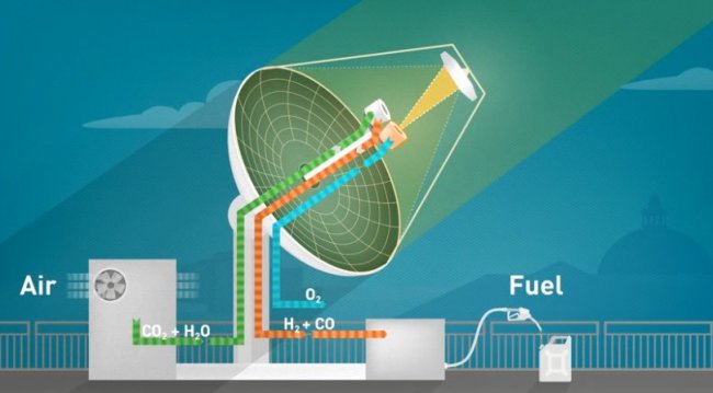 Параболический концентратор в 3000 раз фокусирует солнечный свет на солнечном реакторе, создавая температуру около 1500° C. Внутри реактора находится керамическая конструкция из оксида церия, которая поглощает кислород из поступающего диоксида углерода и воды, производя водород и оксид углерода – синтез-газ. Полученное соединение можно собирать для использования или направлять в третью установку, где оно превращается в жидкое углеводородное топливо, такое как керосин или метанол.
