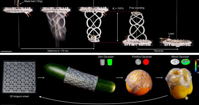 «Мы создали многофункциональный материал для преобразования формы с обратимой и быстрой полиморфной реконфигурацией. Мы сочетаем эластомерный киригами с нетрадиционным обратимым механизмом пластичности в металлических сплавах, чтобы быстро (0,1 секунды) превратить плоские листы в сложные, несущие нагрузку формы с обратимостью и самовосстановлением за счет фазового перехода» - говорится в преамбуле научной статьи.