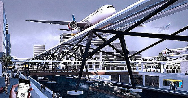 Дизайнер из Стокгольма Алекс Саттон представляет аэропорт не рядом, а внутри мегаполиса. Взлётно-посадочные полосы будут проложены на специальных опорах выше уровня зданий, а вся инфраструктура аэропорта полностью интегрируется с городом.