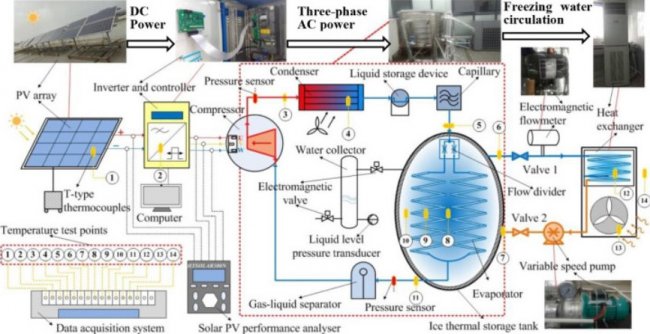 Китайский ученые из Университета Цзясин и Юньнаньского педагогического университета разработали систему кондиционирования воздуха, которая получает электричество от солнечных батарей и запасает его в виде льда. Причем для сохранения энергии используется обычное холодильное оборудование и теплоизолированный резервуар.