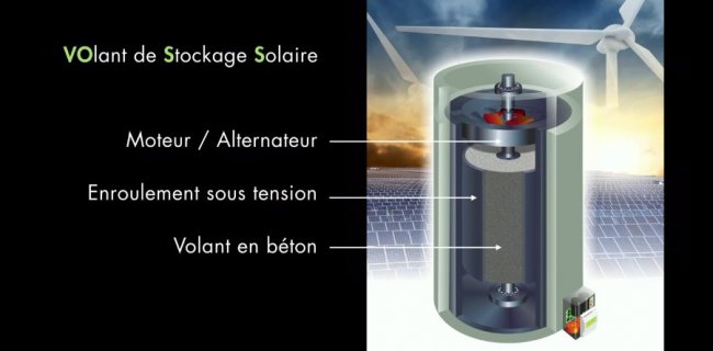 Французский стартап Energiestro представил технологию накопления солнечной энергии при помощи маховика из бетона. Такая система предназначена прежде всего для использования в домашних солнечных электростанциях. Основной элемент разработки — установленный на вертикальной оси цилиндр, соединенный с электродвигателем, который способен работать в качестве генератора.