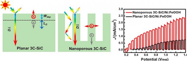 «Главный результат, который мы продемонстрировали, состоит в том, что нанопористый кубический карбид кремния имеет повышенную способность к разделению зарядов, благодаря чему процесс получения водорода из воды идет значительно лучше, чем при использовании карбида кремния с планарной структурой», — рассказал Цзяньву Сунь.