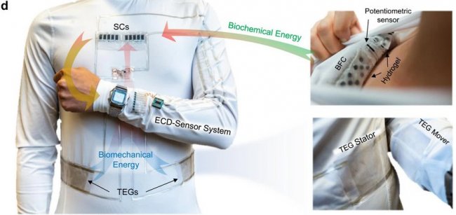 Биотопливные элементы вырабатывают электричество, когда содержащиеся в них ферменты взаимодействуют с потом человека. Трибоэлектрические генераторы производят электроэнергию за счет трения, возникающего, когда руки перемещаются вдоль туловища при беге или ходьбе. Ионисторы накапливают электричество от обоих устройств.