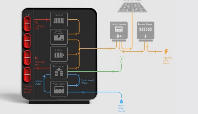 Как правило, сейчас для накопления электроэнергии в домашних системах используются литий-ионные батареи, такие как Tesla Powerwall, Nissan xStorage или Siemens Junelight Smart Battery. Австралийская компания Lavo предлагает альтернативное решение — систему для хранения энергии в виде водорода Green Energy Storage System. Устройство, выполненное в виде шкафа размером 1680×1240×400 мм, весит 324 кг. В нем объединены металлогидридные аккумуляторы для водорода, электролизер, водородный топливный элемент и литий-ионная батарея.