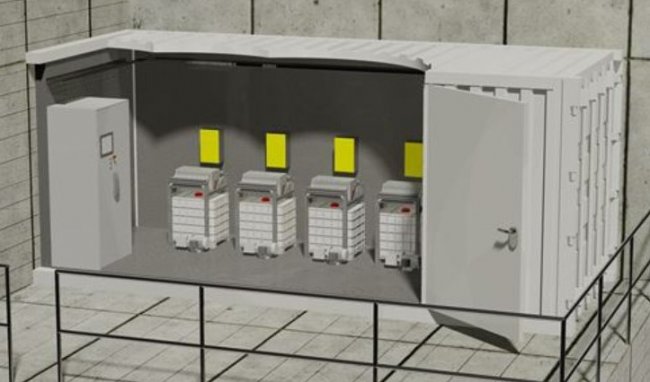 Аккумуляторная система Technoboxx размещена в одном контейнере. Батарея располагает выходной мощностью 15 кВт и может хранить до 75 кВт•ч электроэнергии, которая поступает от солнечных батарей и по мере необходимости используется на производстве. Причем емкость редокс-аккумулятора легко увеличить путем повышения общего объема электролита, а мощность — добавлением новых ячеек топливного элемента.