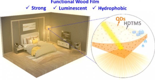 Затем ученые ввели в заготовку другой раствор, вместе с которым пустое пространство в древесине заполнили наночастицы-полупроводники, называемые квантовыми точками, которые светятся при воздействии на них ультрафиолетового излучения. Подобные наночастицы используют, например, в некоторых передовых ЖК-дисплеях телевизоров. После такой обработки дерево спрессовали, высушили и покрыли гидрофобным материалом.