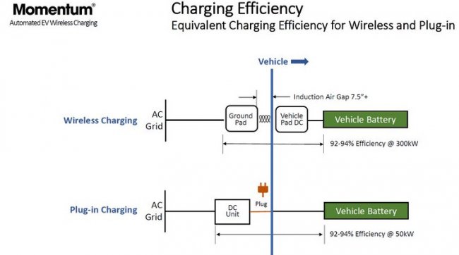 Американская компания Momentum Dynamics утверждает, что беспроводные зарядные устройства не уступают по эффективности передаче энергии по кабелю, при условии соблюдения оптимального расстояния между зарядной станцией и принимающим устройством.