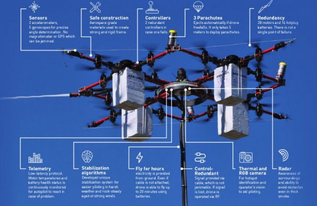 Aerones основали латвийцы Дайнис Крузе и Янис Путрамс в 2015 году. У стартапа есть офисы в Сан-Франциско и в Риге, его специализация – создание БПЛА с грузоподъемностью до 200 кг, питание к которым поступает через провода с земли или от бортовых батарей.