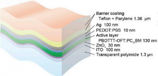 Ученые под руководством Такао Сомэя (Takao Someya) из японского Института физико-химических исследований (RIKEN) разработали органические солнечные панели с высокой для такого класса устройств эффективностью, а также гибкостью и способностью длительно работать в условиях высоких температур. Панель представляет собой пленку толщиной в три микрометра. Около трети микрометра занимают несколько слоев, ответственных за выработку энергии. Они изолированы от окружающей среды с помощью слоев парилена и тефлона с одной стороны и полиимида с другой. Эти материалы защищают основную часть солнечной панели от воздействия тепла и не лишают устройства гибкости.