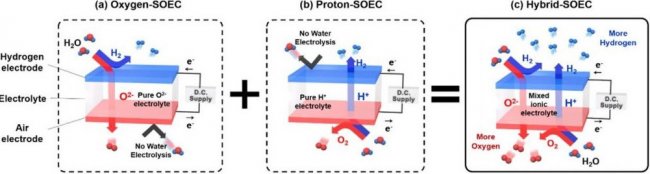 Сохранив все преимущества твердотельного электролизера, исследователи разработали новую высокоэффективную гибридную систему (Hybrid-SOEC), в которой используется проводник со смешанными ионами для одновременного переноса как отрицательно заряженных ионов кислорода, так и положительно заряженных ионов водорода (протонов).