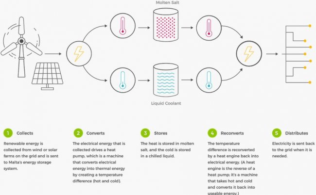 Технология “Malta” от Alphabet предполагает преобразование солнечной или ветровой энергии в тепловую. В качестве горячего теплоносителя выступает расплавленная соль, а холодного – антифризный раствор. По мере необходимости тепловая энергия преобразуется в электрическую с использованием теплового двигателя. Чем больше разница температур между теплоносителями, тем эффективнее происходит выработка электричества. Ранее для подобных проектов планировали использовать обычную воду, но расплавленная соль оказалась более энергоэффективной.