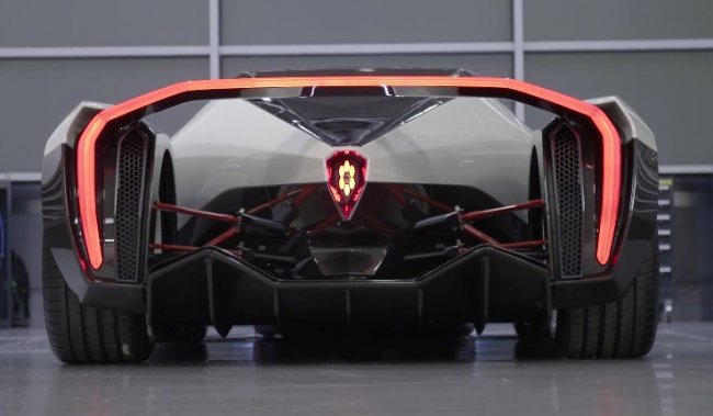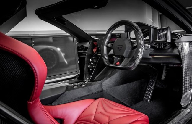 Углеродное волокно широко использовано и во внутренней отделке электрокара. Интерьер предельно минималистичен, но вместе с тем очень функционален. На общем чёрном фоне в глаза сразу бросаются ярко-красные кресла. Они простёганы и внешне напоминают мышечную ткань.