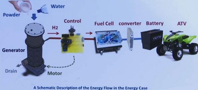 «Мы разработали систему, которая может генерировать водород для электромобиля. Она построена на химической реакции, которая происходит, когда запускаешь двигатель. Водород начинает циркулировать, появляется электроэнергия, батареи заряжаются, можно двигаться! Но особенность нашей системы в том, что водород хранится очень плотно - не так, как в топливном баке, под высоким давлением и с низкой плотностью энергии», - рассказывает разработчик мотора Алекс Шехтер.