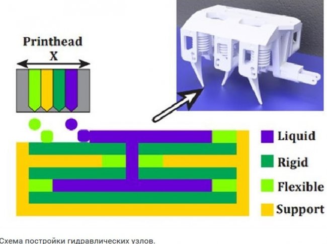 Для этого разработчикам пришлось "хакнуть" принтер так, чтобы он печатал не только твердые и гибкие материалы, необходимые для подвижных роботов, но и создавал гидравлику с добавлением жидкостей.