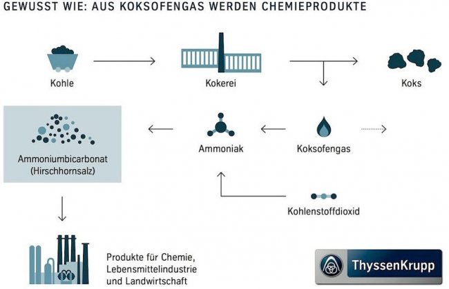 Установка производит из выхлопных газов карбонат аммония. Функционирует это следующим образом. Сначала с помощью сложного технологического процесса с коксовой печи вымываются соли аммония. Затем при добавлении диоксида углерода возникает бикарбонат аммония. Как известно, эту соль в течение столетий применяют для выпечки в качестве разрыхлителя.